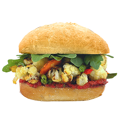Green beans, carrots, cauliflower, onion, red peppers, yellow peppers, herb tomato spread, arugula, balsamic vinaigrette on toasted ciabatta
