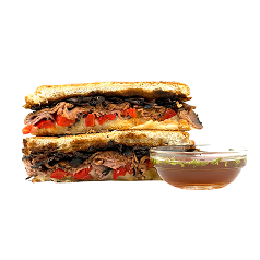 Sliced roast beef, balsamic onion relish, roasted red peppers, Cabot white cheddar cheese on pressed ciabatta with side of Au Jus