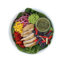 Chicken, smashed avocado, corn, roasted red peppers, pickled red onions, tortilla crisps, mixed greens, house made LBV