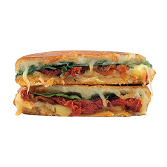 Cabot white cheddar cheese, mozzarella cheese, garlic aioli, roasted tomatoes, spinach on a pressed ciabatta
