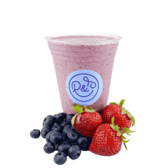 Acai, almond milk, banana, strawberry, blueberry, topped with granola, blueberries, strawberry slices, banana slices, and honey
